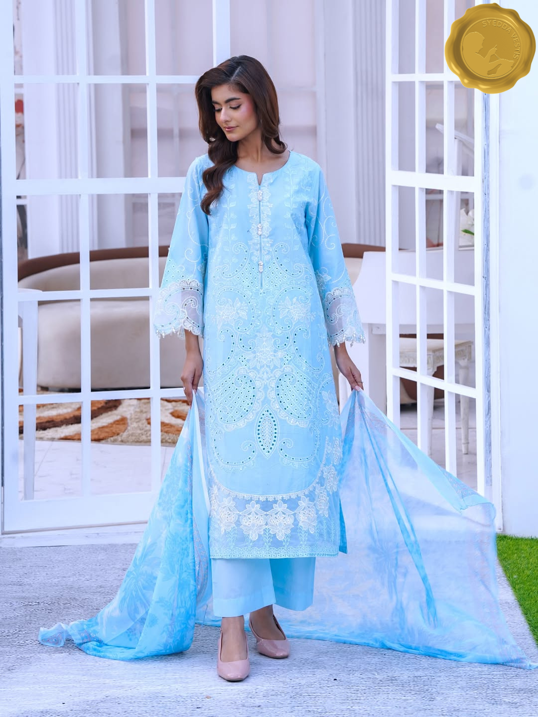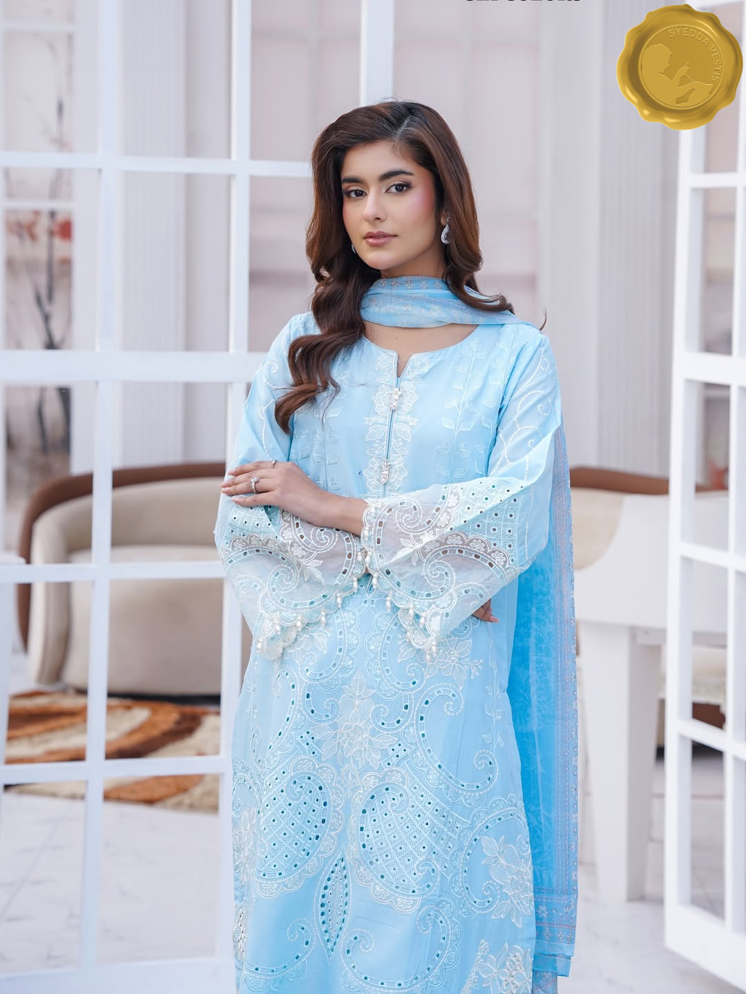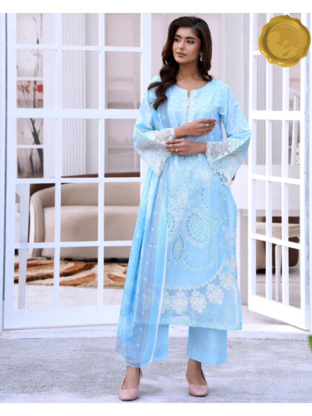This stitched 3-piece aqua blue lawn suit features delicate white embroidery, lace accents, and a printed dupatta.