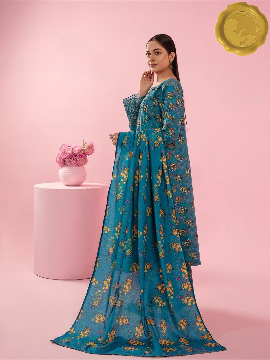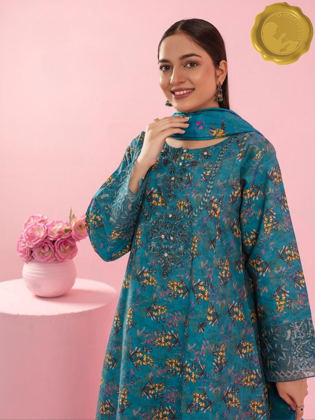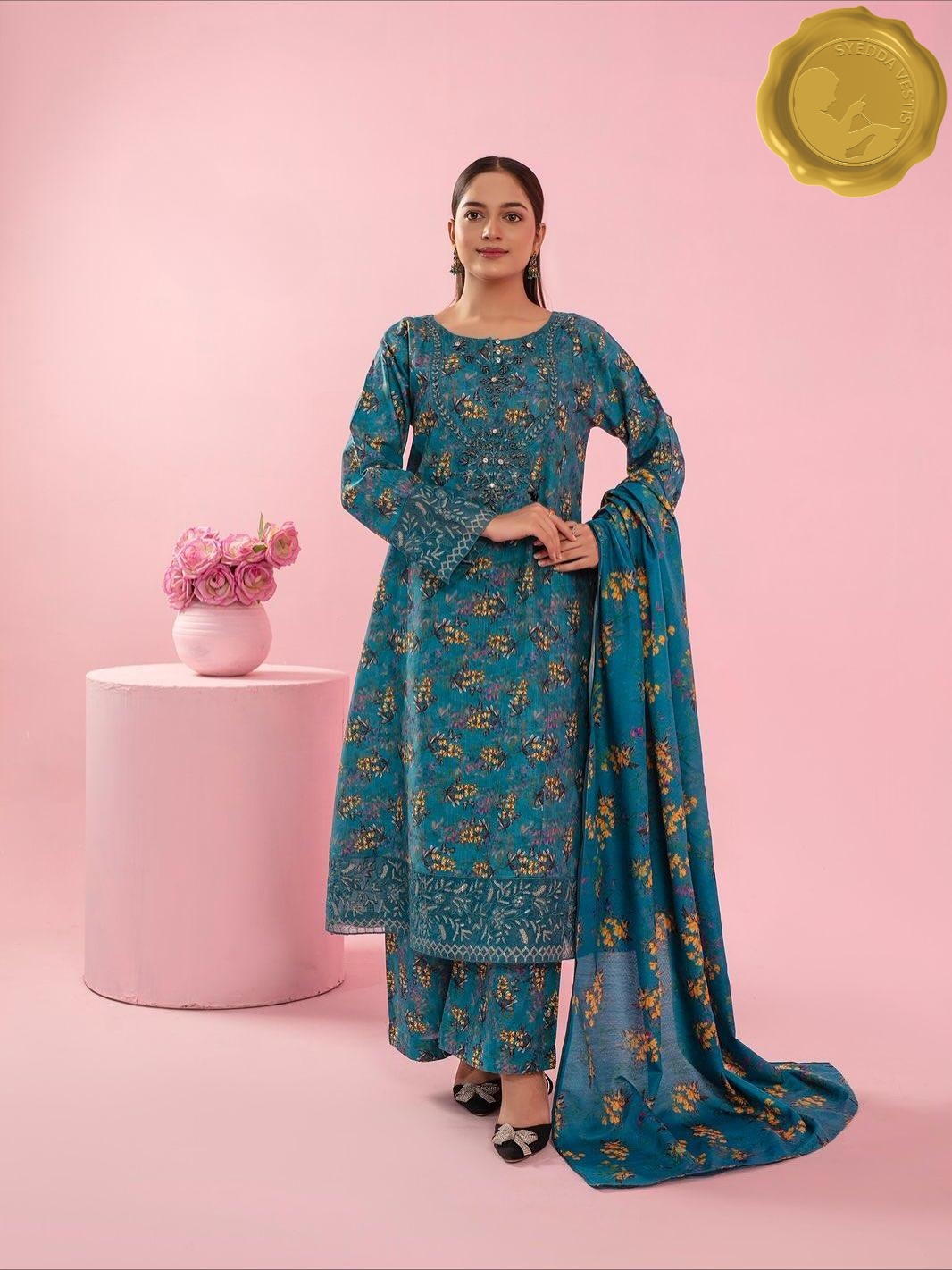 Let your winter wardrobe bloom with Bahaar , a khaddar outfit that brings floral joy to chilly days. This 3-piece suit features soft khaddar fabric adorned with yellow and orange floral embroidery, paired with matching palazzo trousers and a flowing dupatta.