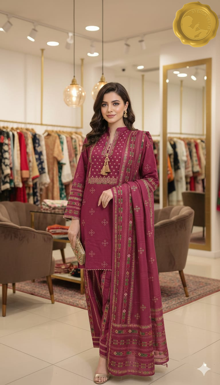 Celebrate Eid in elegance with Syedda Vestis’ stitched 3 piece cotton lawn ensemble.