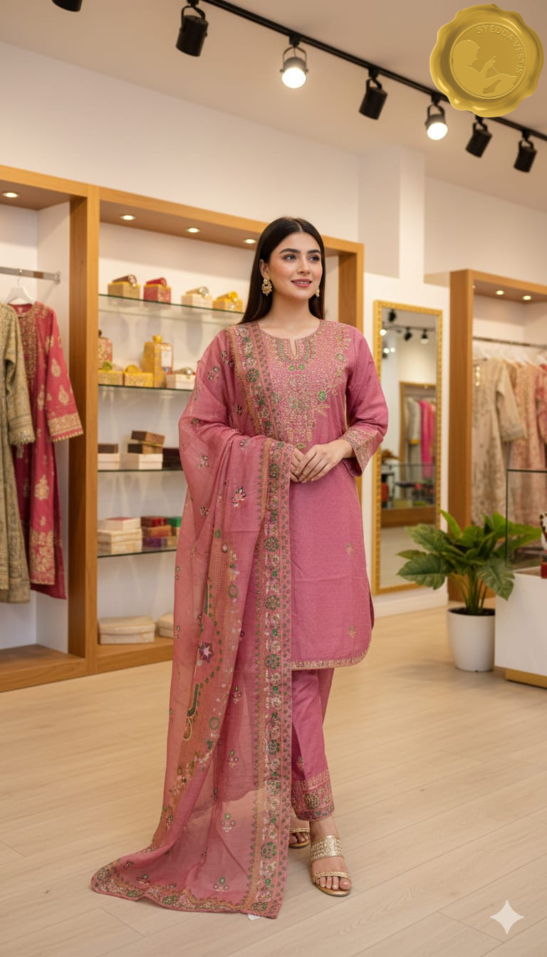 Elevate your festive style with Syedda Vestis’ stitched 3 piece cotton lawn ensemble.