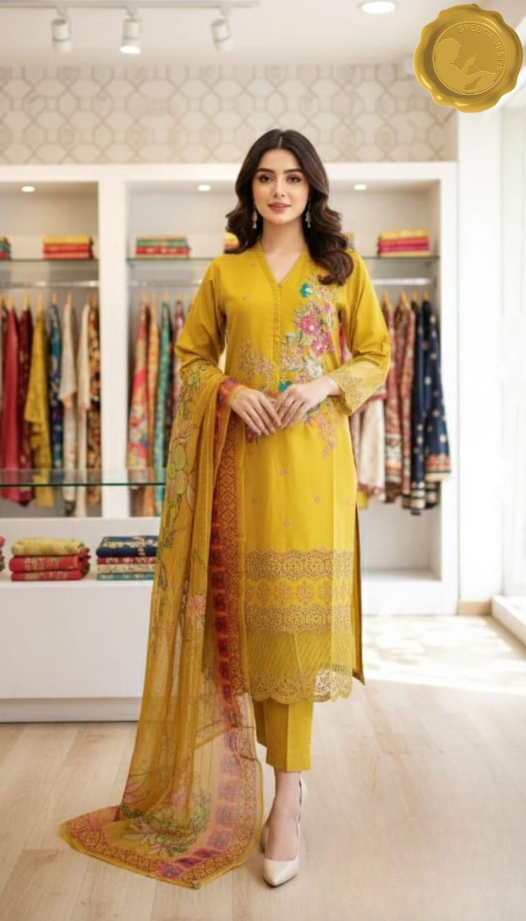 Brighten your Eid celebrations with Syedda Vestis’ stitched 3 piece cotton lawn ensemble.
