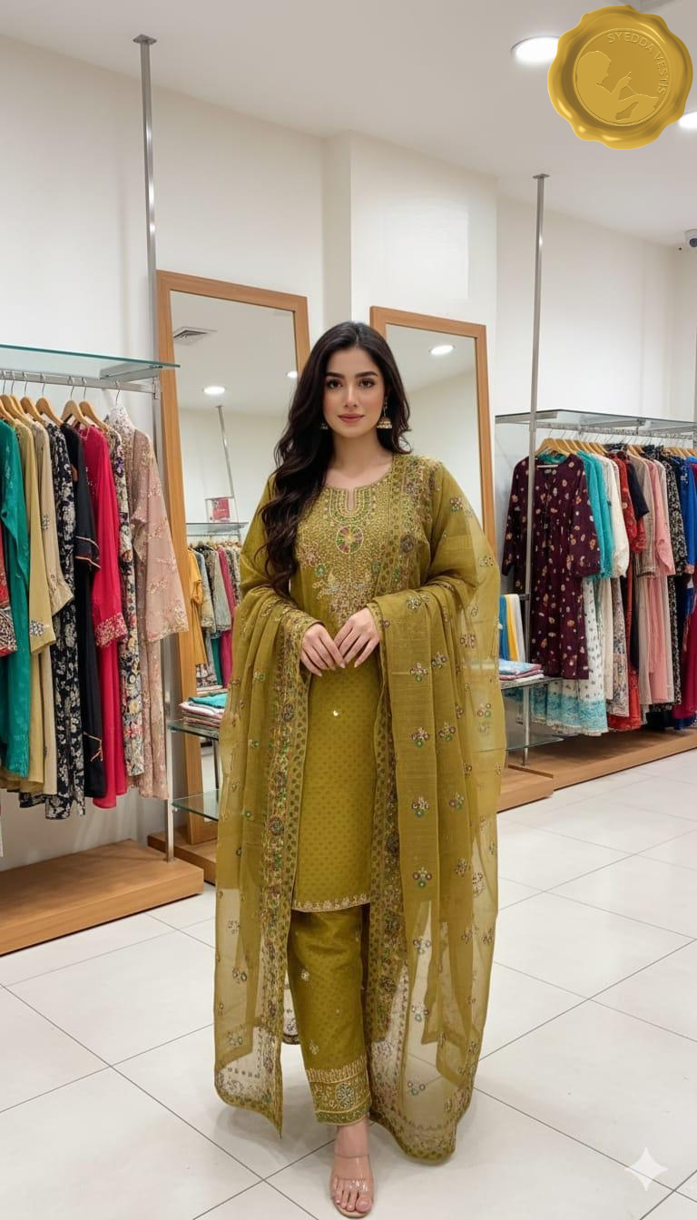 A radiant mustard yellow stitched 3-piece cotton suit with intricate floral embroidery and a sheer dupatta.