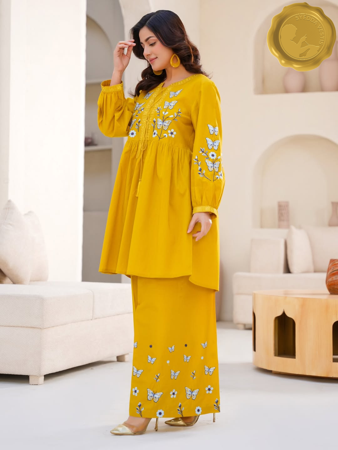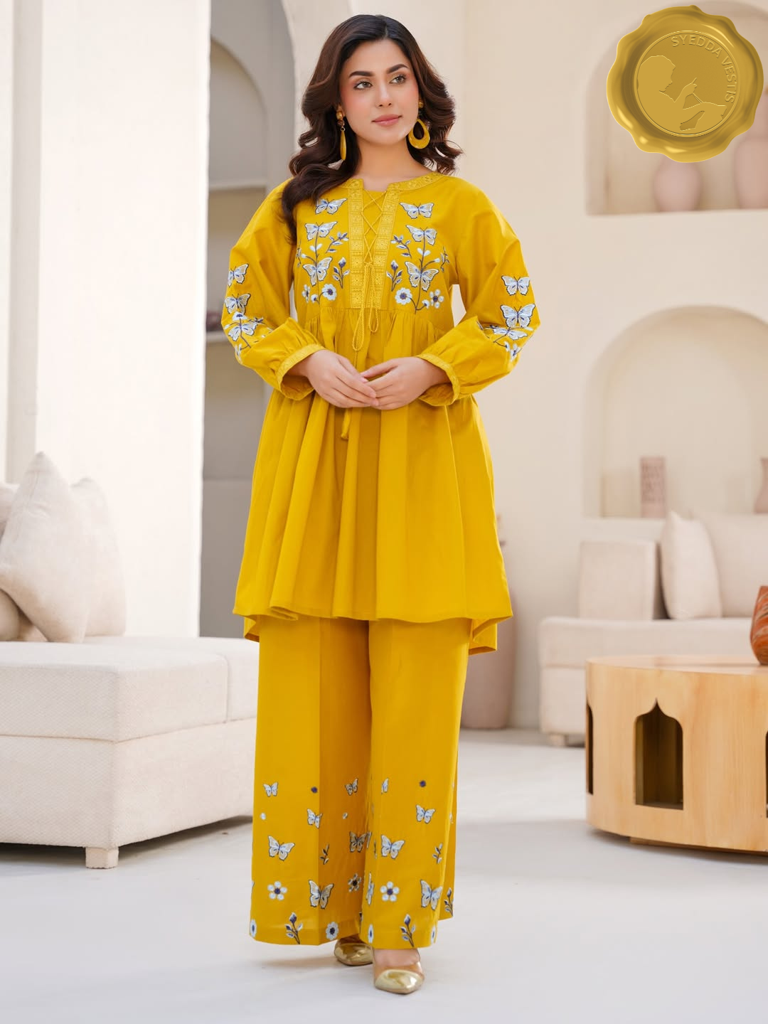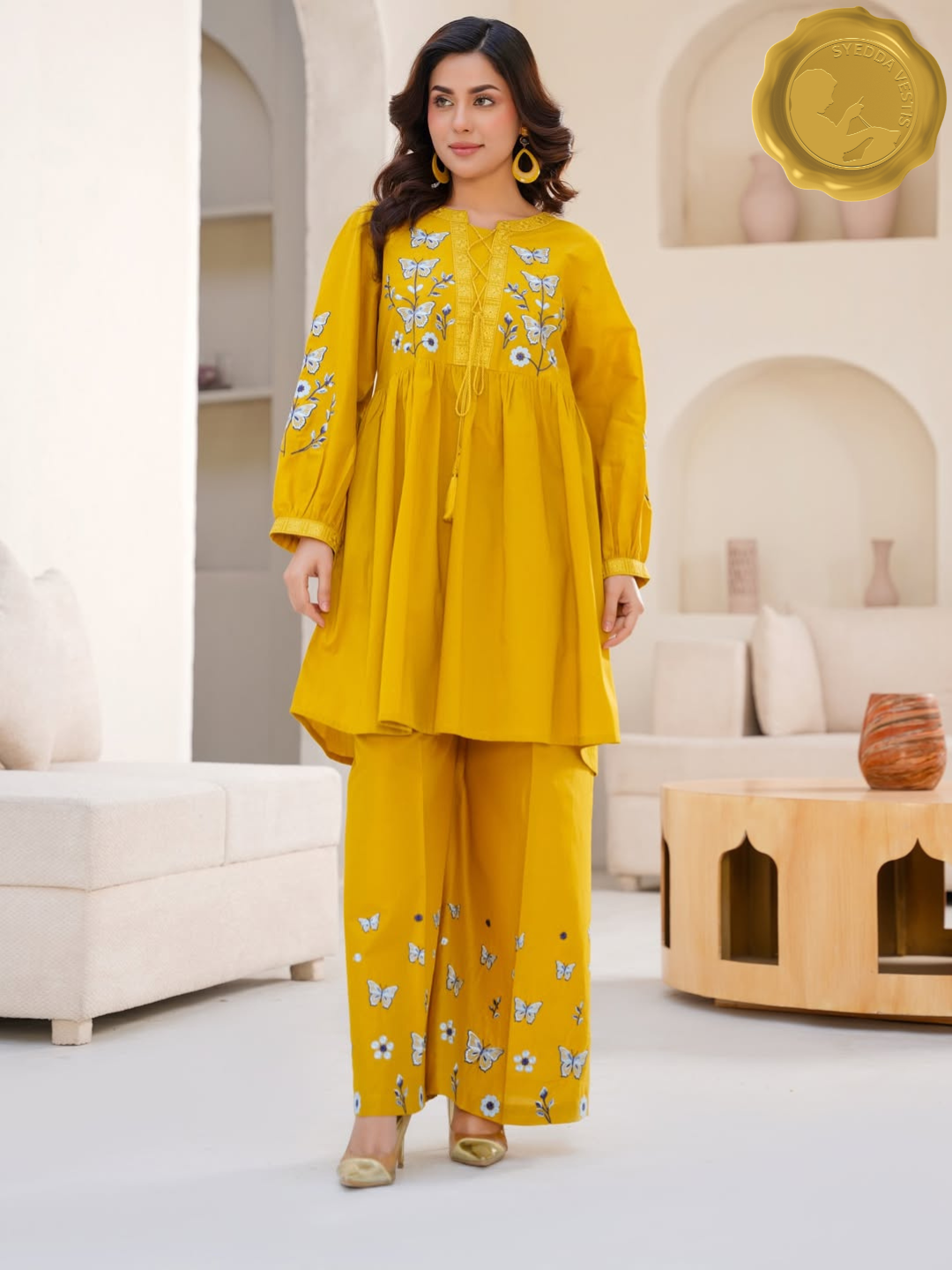Adorned with delicate white and blue floral embroidery and butterfly motifs, the kurta features a drawstring waist and patterned yoke.