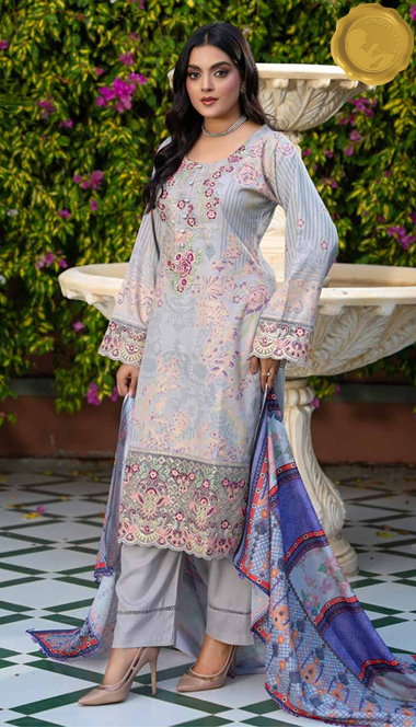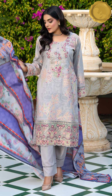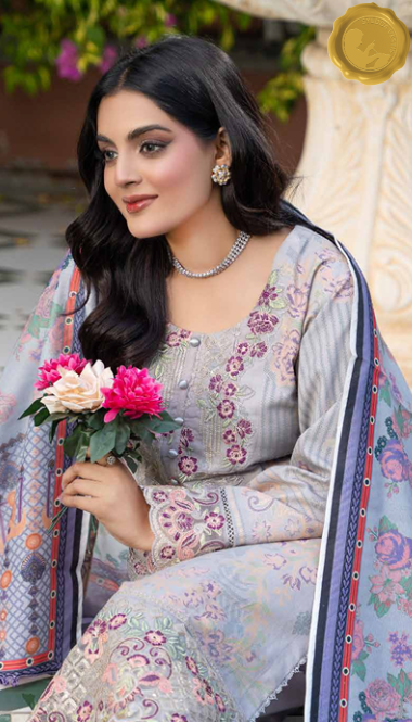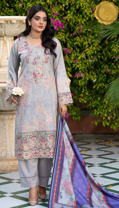 Step into winter with this stitched Dhanak suit from the Royal Touch collection. The soft grey kameez features delicate floral embroidery in pink, green, and purple, paired with matching trousers and a vibrant multicolor dupatta in blue, orange, and red. Designed for daily wear, this ready-to-wear outfit blends comfort with elegance.
