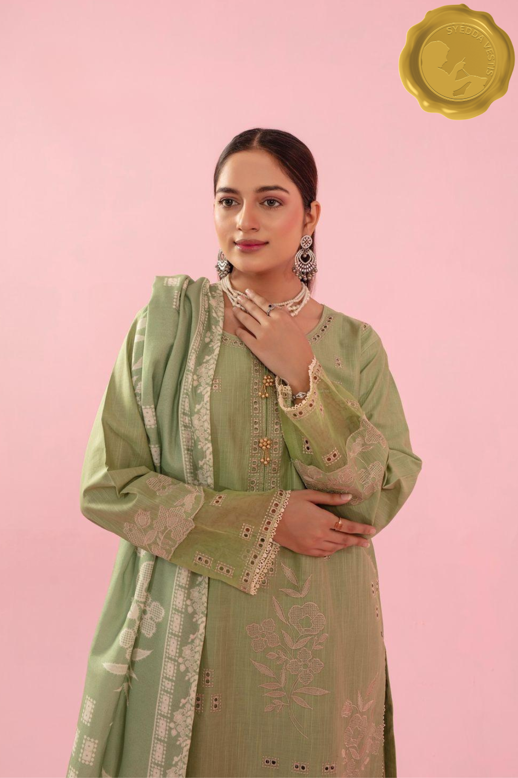 Step into winter with Hunar , a soft green khaddar outfit that blends tradition with everyday elegance. Designed for comfort and charm, this 3-piece suit features delicate floral embroidery in beige and white, paired with a matching dupatta and straight trousers.