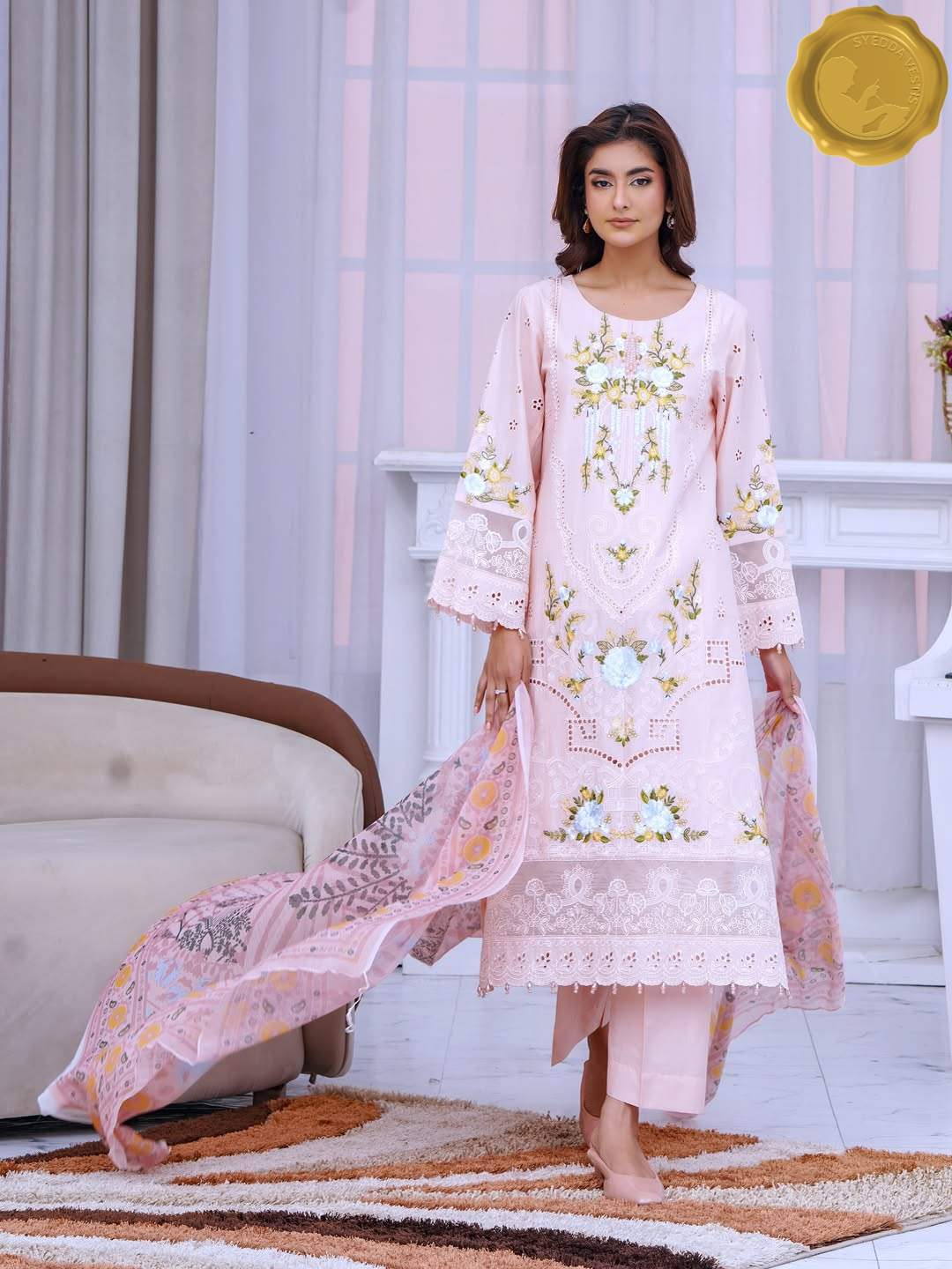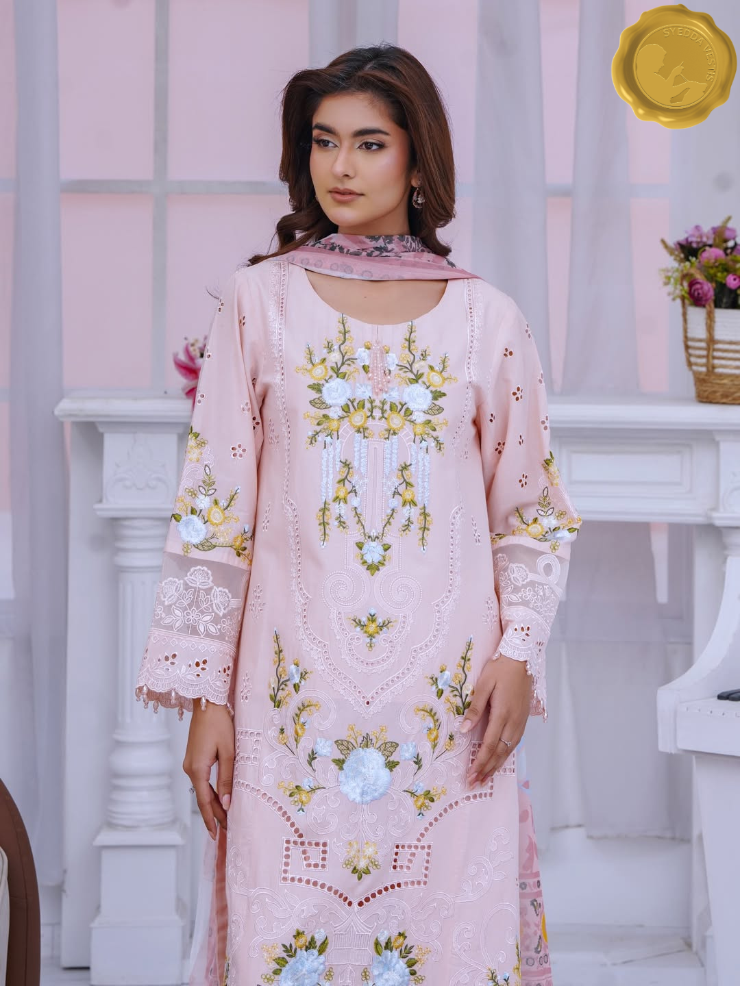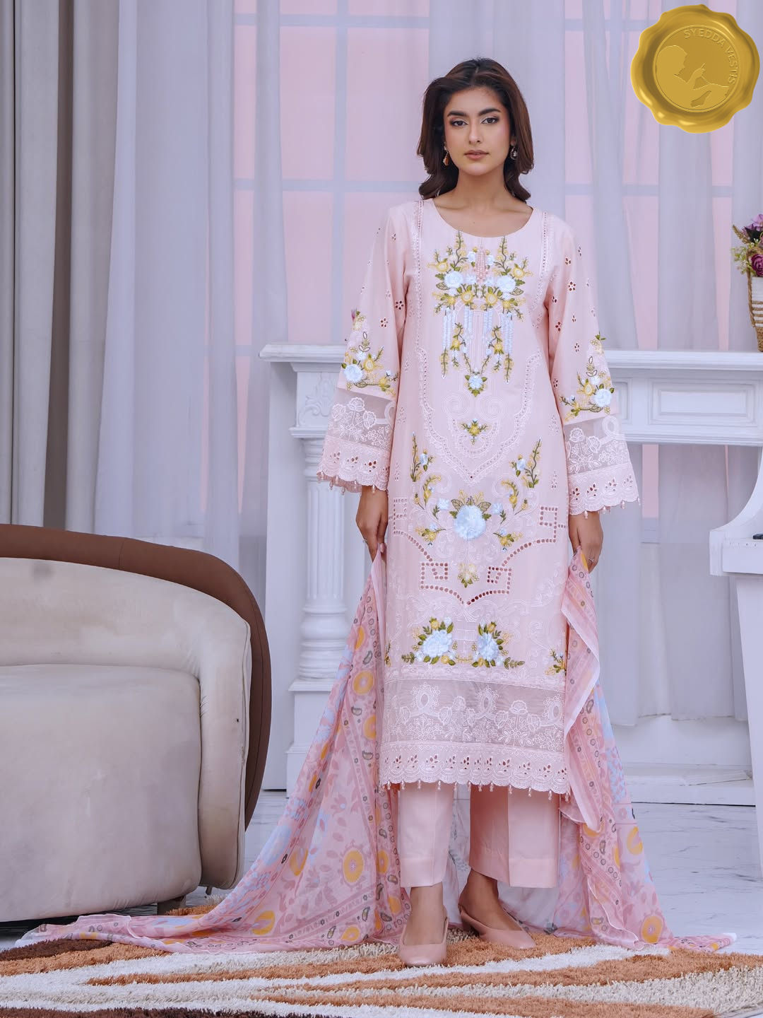 Grace your Eid gatherings with this pastel peach 3-piece lawn outfit, adorned with delicate floral embroidery and lace detailing. Paired with a printed dupatta.