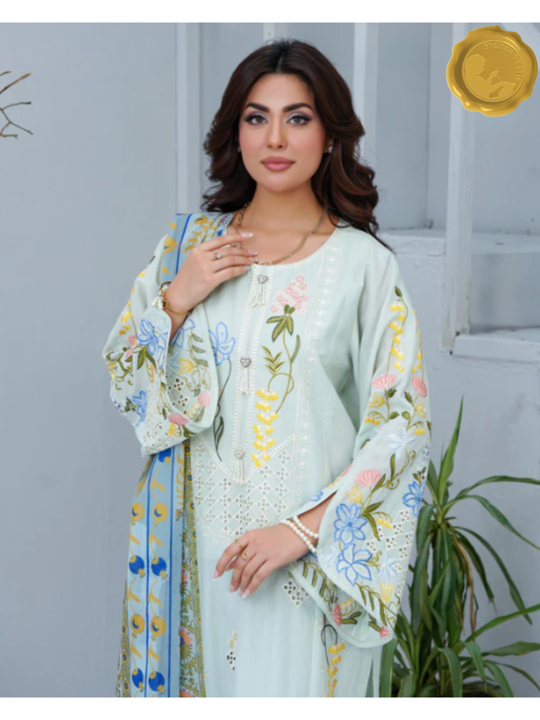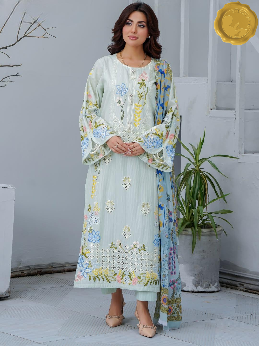 Celebrate Eid in elegance with this light pista 3-piece lawn ensemble, featuring intricate multicolor floral embroidery and a printed dupatta.