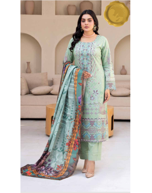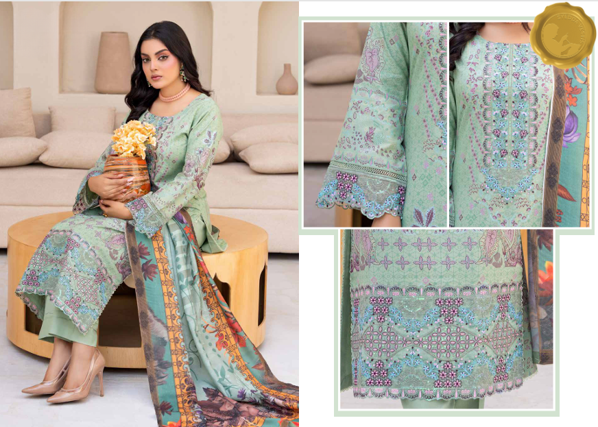 “Mint Majesty” from our Royal Touch collection is a winter-ready stitched 3-piece ensemble in soft green Dhanak fabric. The kameez features intricate embroidery in purple, blue, and pink tones, with lace detailing on the sleeves and hem. Paired with a vibrant printed dupatta showcasing multicolored floral and abstract motifs, this outfit is a refined choice for formal winter occasions.