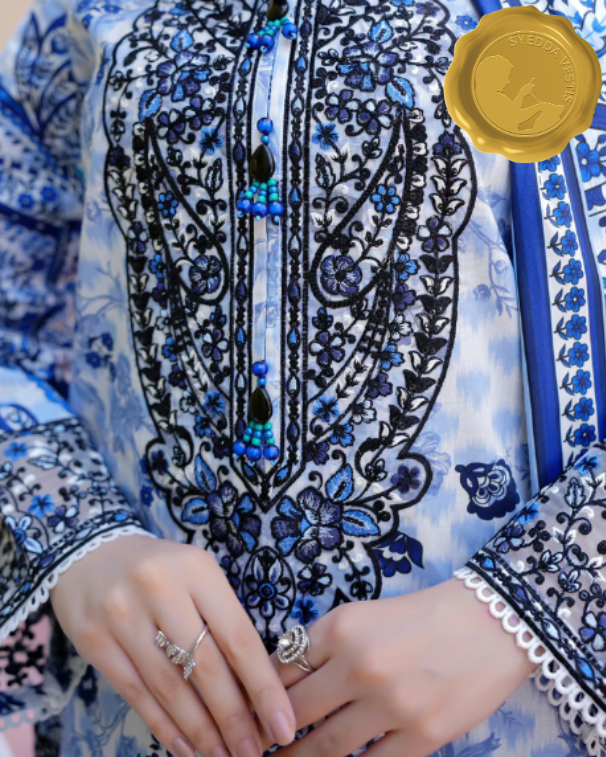 - 👗 Shirt: Front embroidered with delicate floral and geometric motifs, paired with printed accents. Fabric: Khaddar – breathable, warm, and ideal for winter.