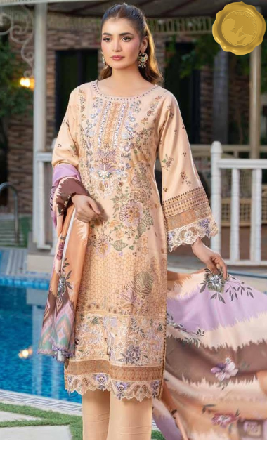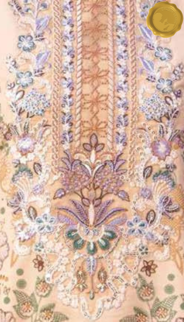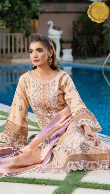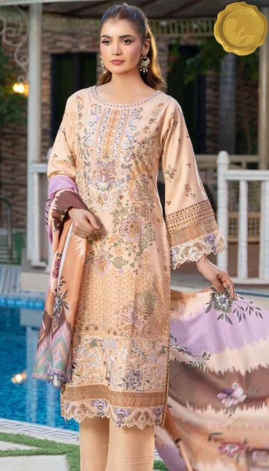 Embrace winter elegance with this stitched Dhanak suit from Syedda’s Blush Bloom collection. The peach kameez showcases delicate floral embroidery and lace detailing, paired with matching trousers and a printed dupatta in soft purple and peach tones. A graceful choice for daily wear with a refreshing aesthetic.