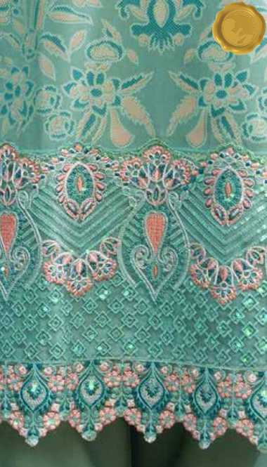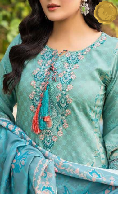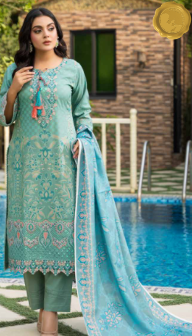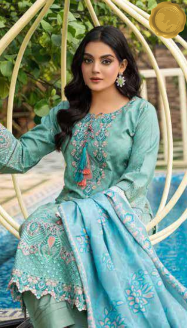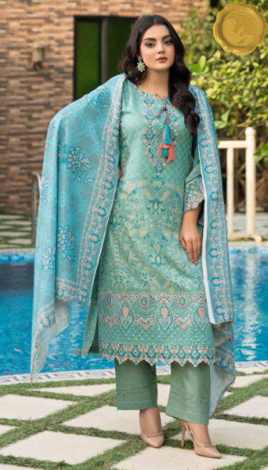Add a serene splash to your winter wardrobe with this stitched Dhanak suit from Syedda’s Royal Touch collection. The light teal kameez features intricate pink and silver embroidery, tassel accents, and lace detailing, paired with matching trousers and a coordinating dupatta. Designed for graceful daily wear with a touch of charm.