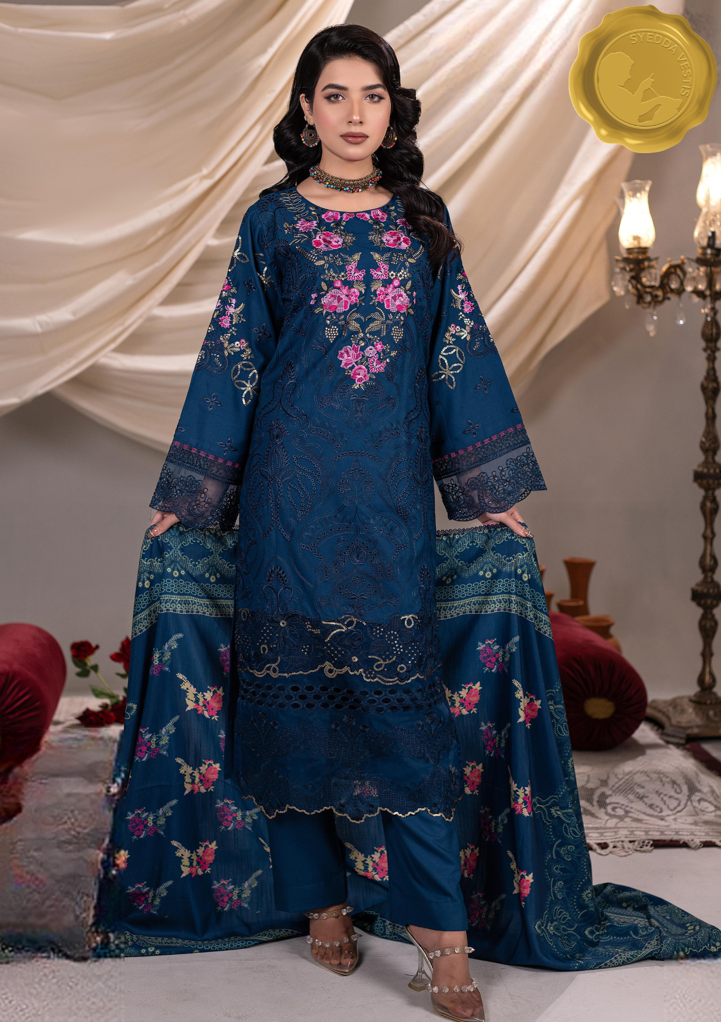 Step into serene sophistication with Surkam – The Indigo Bloom, a 3-piece luxury embroidered Dhannak suit crafted for winter elegance. This ensemble is a tribute to timeless beauty, boutique finesse, and the art of graceful dressing.