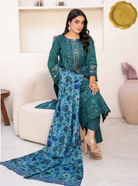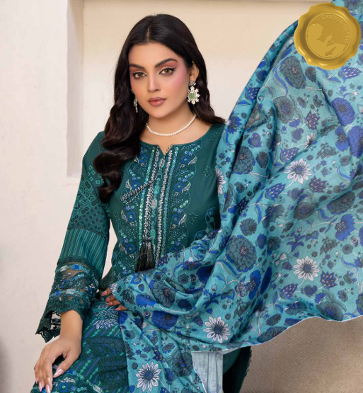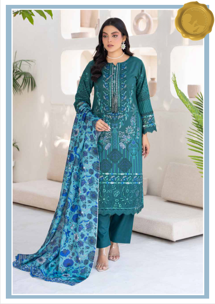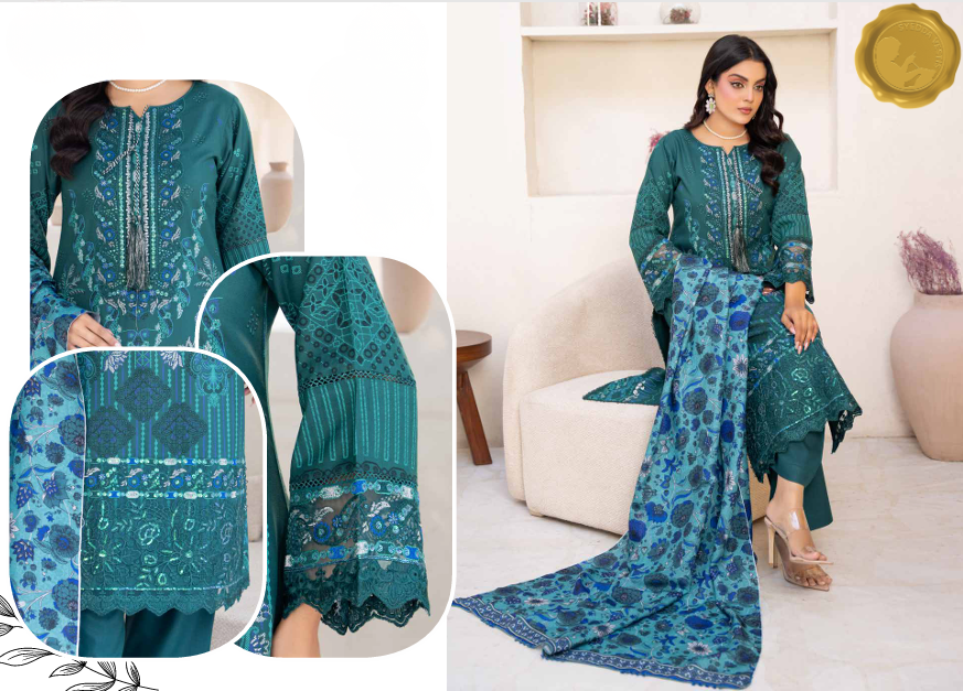 “Teal Radiance” from our Blush Bloom collection is a winter-ready stitched 3-piece ensemble in rich teal Dhanak fabric. The kameez features intricate embroidery in silver and blue tones, with floral and geometric motifs gracing the neckline, sleeves, and hem. Paired with a printed dupatta in vibrant blue florals, this outfit is a perfect blend of elegance and warmth for formal occasions.