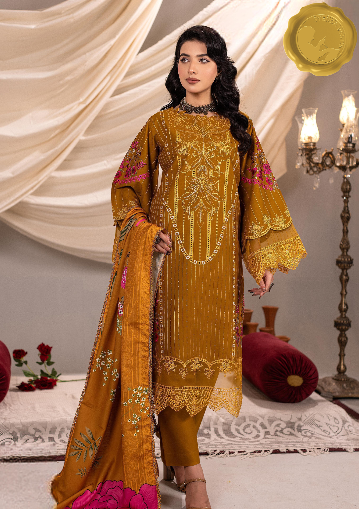 Wrap yourself in warmth and wonder with Zarnigar – The Golden Whisper, a 3-piece luxury embroidered khaddar suit designed for winter elegance. This ensemble blends tradition with modern finesse, featuring: