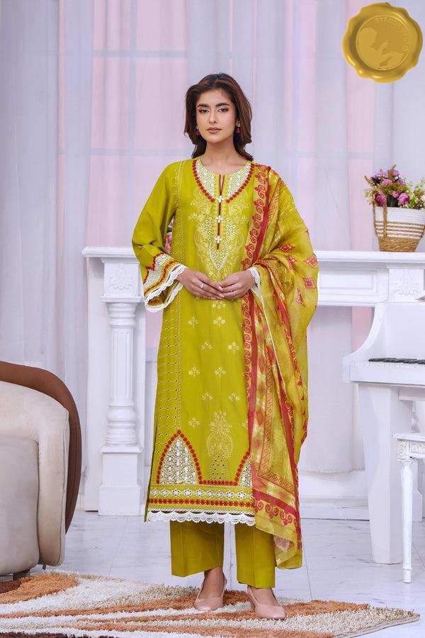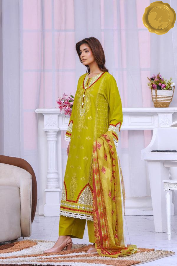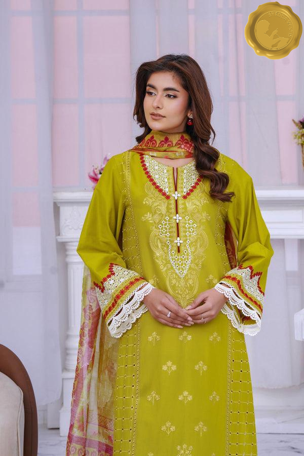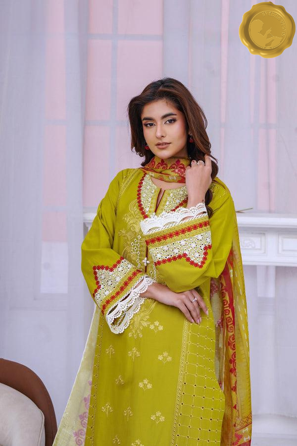 Celebrate Eid in timeless elegance with this stitched 3-piece lawn embroidered outfit.