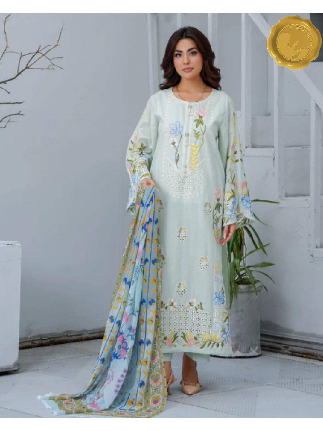 Celebrate Eid in elegance with this light pista 3-piece lawn ensemble, featuring intricate multicolor floral embroidery and a printed dupatta.