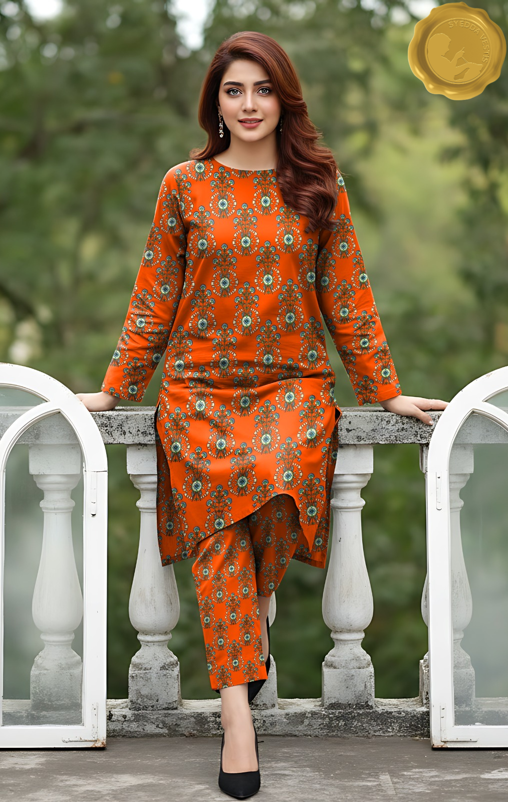 Add warmth and vibrance to your winter wardrobe with this 2-piece unstitched Marina wool suit in rich orange, featuring a symmetrical printed design in green, blue, and gold. Soft, breathable, and perfect for daily wear.