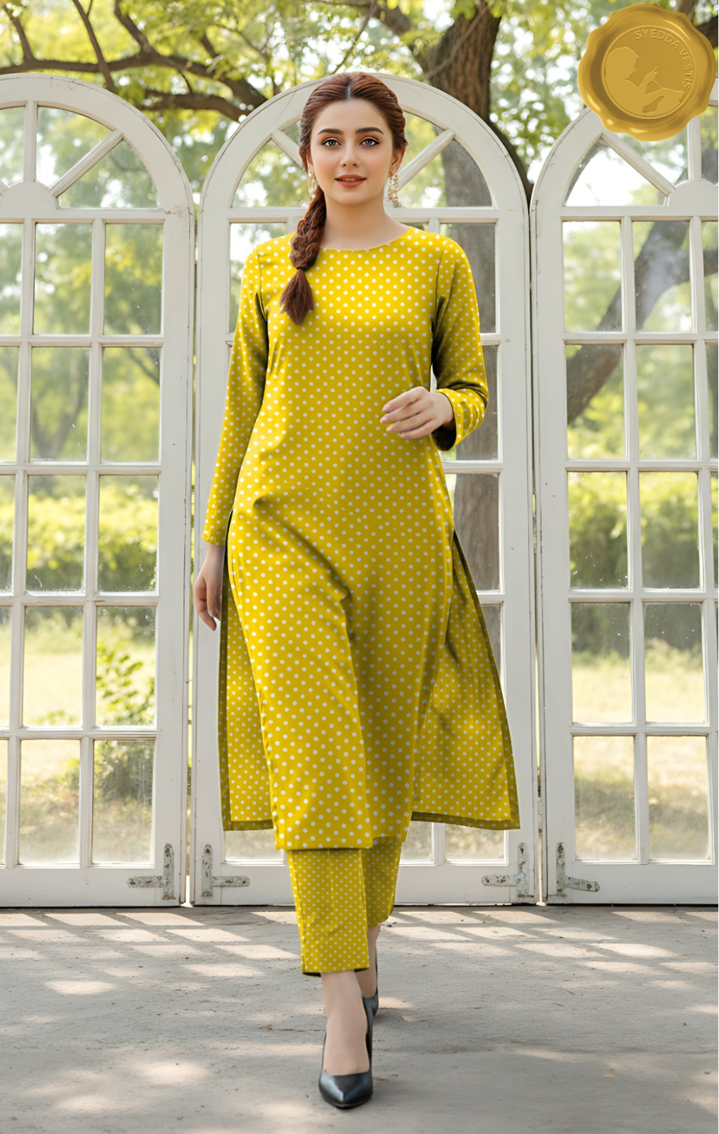 Stay cozy and stylish this winter with Syedda Vestis’ 2-piece unstitched suit in vibrant yellow. Crafted from soft Marina wool and adorned with printed patterns, it’s perfect for daily wear with a touch of elegance.